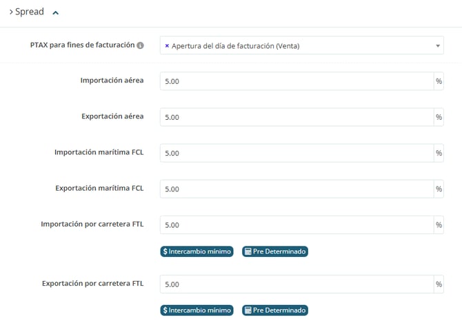 Si el Spread está bloqueado, según la imagen superior, es necesario contactar al cliente, ya que debe ser informado sobre el cambio. De esta forma, actualizará su registro. De lo contrario, podrá introducir el porcentaje para cada una de las modalidades.