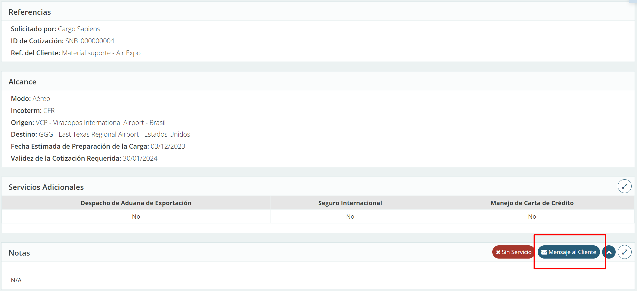Siempre será necesario ingresar a una cotización para realizar esta comunicación. El cliente recibirá este mensaje por correo electrónico. Es importante destacar que la cotización SPOT no necesita estar abierta para que la comunicación ocurra.