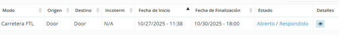 Identifica la cotización SPOT que deseas responder y asegúrate de que el estado de la cotización, en el lado derecho, esté como "Abierta".