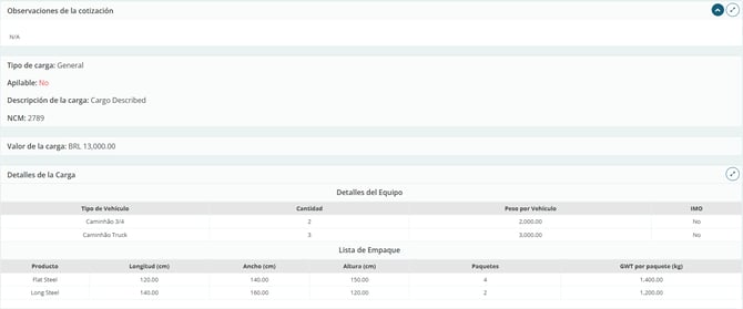 En las primeras tablas de la página, lee atentamente la información ingresada en los campos "Referencias", "Alcance" y "Notas", ya que se refieren a los detalles del envío. Esto también aplica a los campos de tipo de carga, apilable o no, descripción, valor y detalles de la carga.