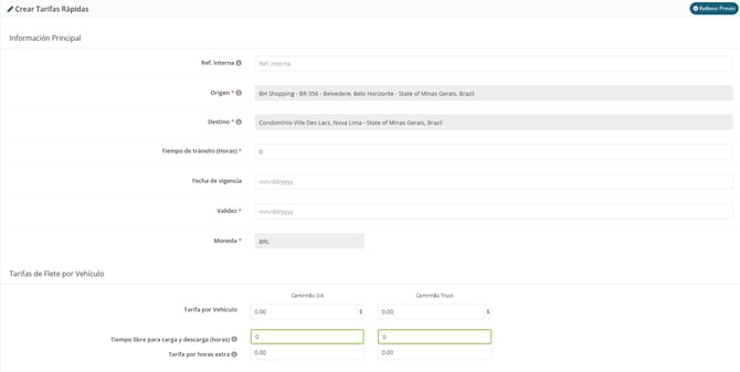 Tarifas de Flete: ingresa el valor por vehículo en el caso del FTL o por kilogramo en el caso del LTL;