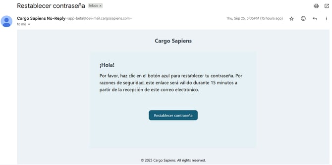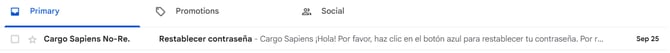 En caso de no encontrar el correo en la bandeja de entrada, verifique las carpetas de Spam o Correo no deseado y confirme con el área de TI de su empresa si el dominio @cargosapiens.com está autorizado para el envío de mensajes. Si el problema persiste, contacte a uno de nuestros agentes para que podamos analizar el caso con mayor detalle.