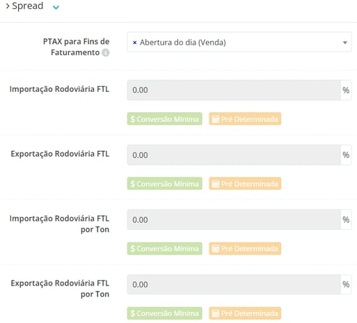Se o Spread estiver bloqueado, conforme a imagem acima, é necessário contatar o cliente, pois ele precisa ser informado sobre a mudança. Dessa forma, ele atualizará seu cadastro. Do contrário, você poderá inserir a porcentagem para cada um dos modais.
