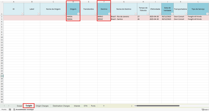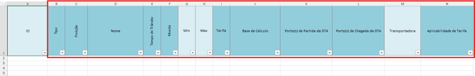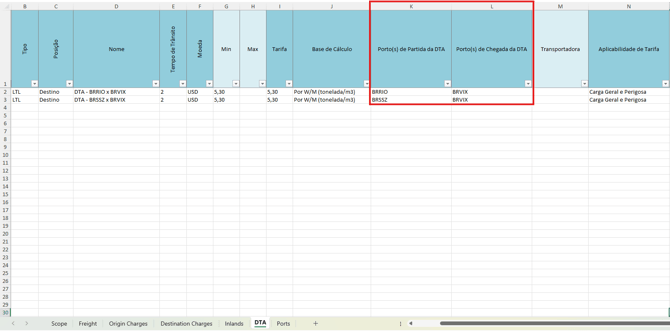 OBS: se a tarifa de DTA variar conforme faixas de peso, é necessário informar separadamente os valores para cada faixa (aplicável apenas para planilhas do modal aéreo). Dessa forma, o sistema aplicará automaticamente a precificação correta de acordo com o peso da carga.