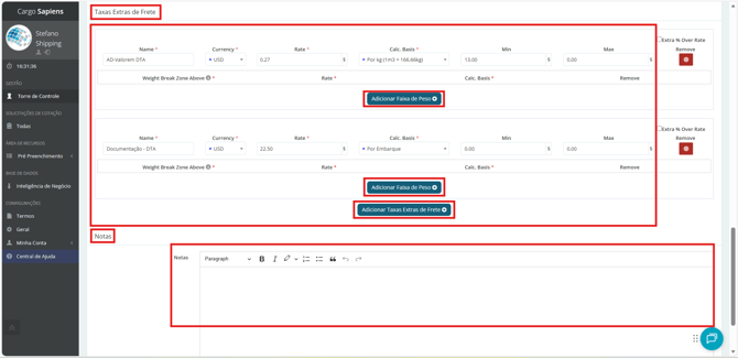 Para isso, clique em “Add Freight Extra Charges” e preencha conforme necessário. O sistema também permite configurar para que determinada taxa seja aplicada somente a partir de uma faixa específica de peso, utilizando o botão “Adicionar Faixa de Peso”.