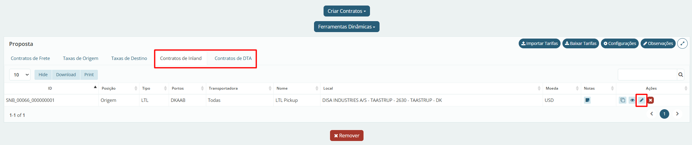 Entre no sistema e clique no botão de olhinho ao lado direito do BID que deseja editar. Na tela interna do BID, clique em "Contratos de Inland" ou "Contratos de DTA" e o edite. É necessário que já tenha sido importado algum contrato para que essa opção de edição apareça.