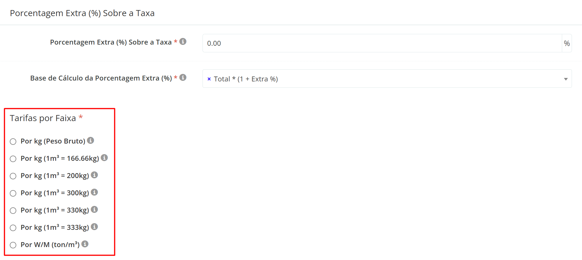 No campo abaixo é possível ajustar a forma como o sistema interpreta o cálculo da DTA, utilizando o campo “Tarifas por Faixa”. Ou seja, trata-se da forma como o sistema interpretará o peso da carga para a devida aplicabilidade da tarifa em uma determinada faixa de peso.