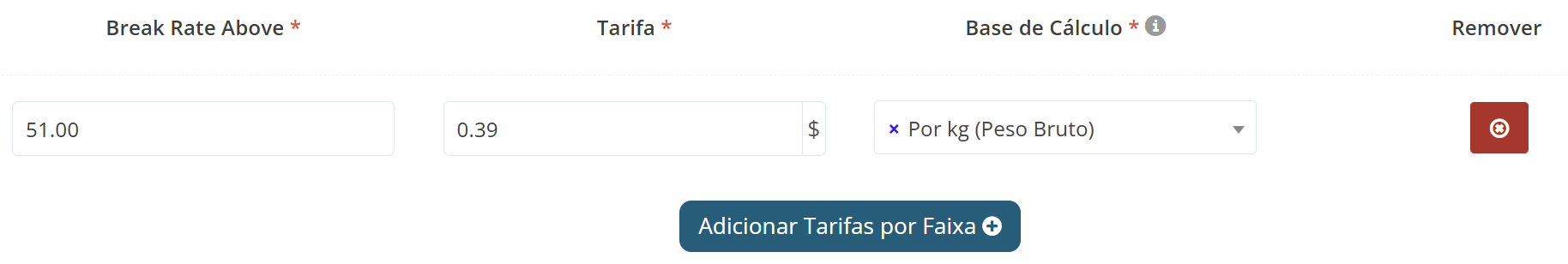 Exemplo: se você preencheu no campo de tarifas de DTA 0,25 e no configurações avançadas você preencheu na primeira faixa 51kg é cobrado 0,39/kg , o sistema entenderá: acima de 51kg, vou cobrar 0,39 dólares por KG, conforme preenchimento abaixo, abaixo de 51kg será cobrado o que foi informado no campo de tarifas fora do configurações avançadas.